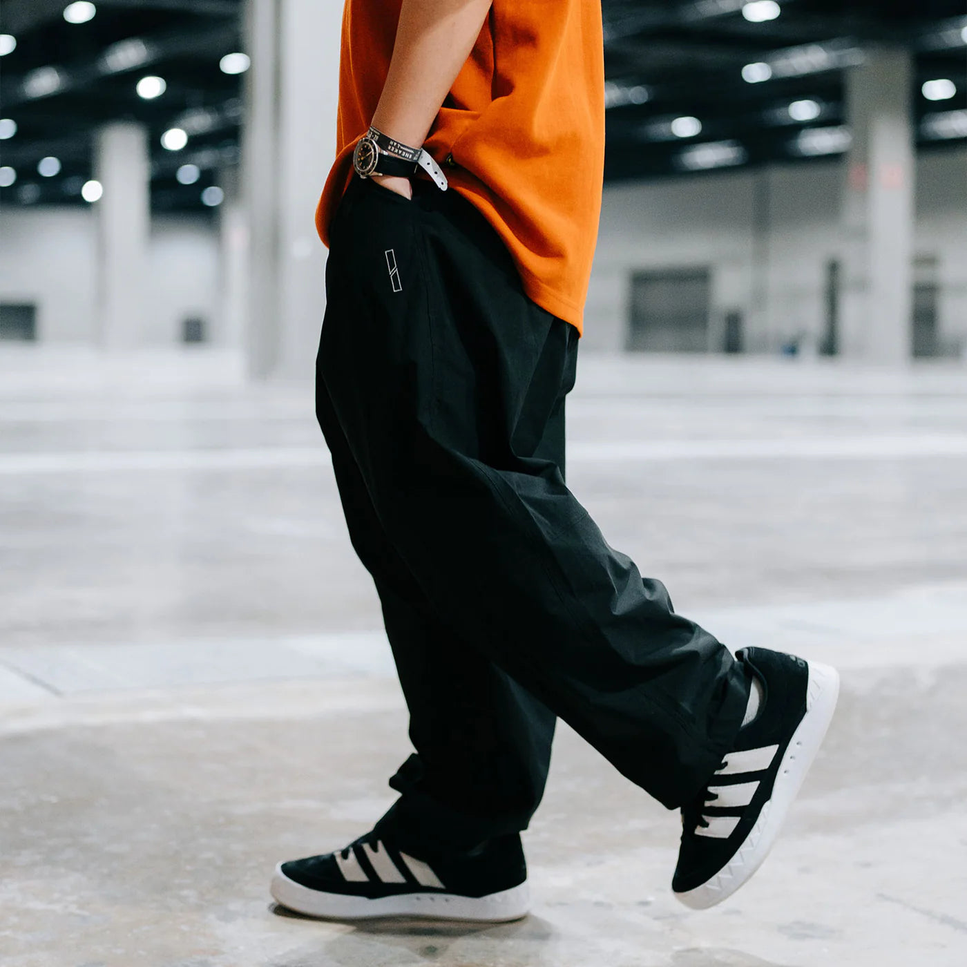 Designed from lightweight polyester fabric, these tapered long pants have a loose fit, stretchable waist, and a plastic zipper for maximum comfort. With handy side and back pockets for extra storage and a subtle brand motif, they’re perfect for casual to formal wear.