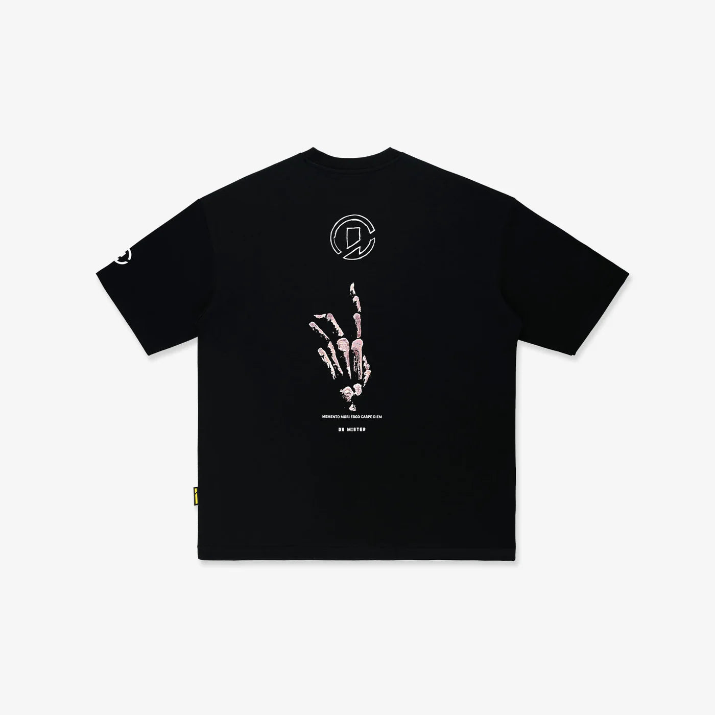 This black, broad tee is crafted from a heavyweight cotton-polyester blend fabric. The standout design on the back features a skeleton hand touching our circular graphic logo, which resembles an igniting “logo.” The front boasts our branding and the collection's phrase. The round graphic logo is also printed on the left sleeve.