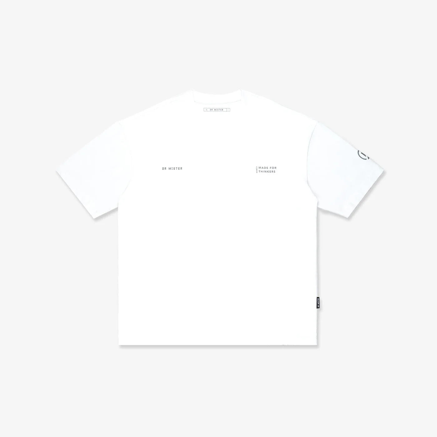 White broad tee created from heavy weight combed cotton designed for minimal lovers. Printed with mini logotype and brand tagline on each side at the front and an oversized outline logotype at the back. Round graphic logo is printed on the left sleeve.