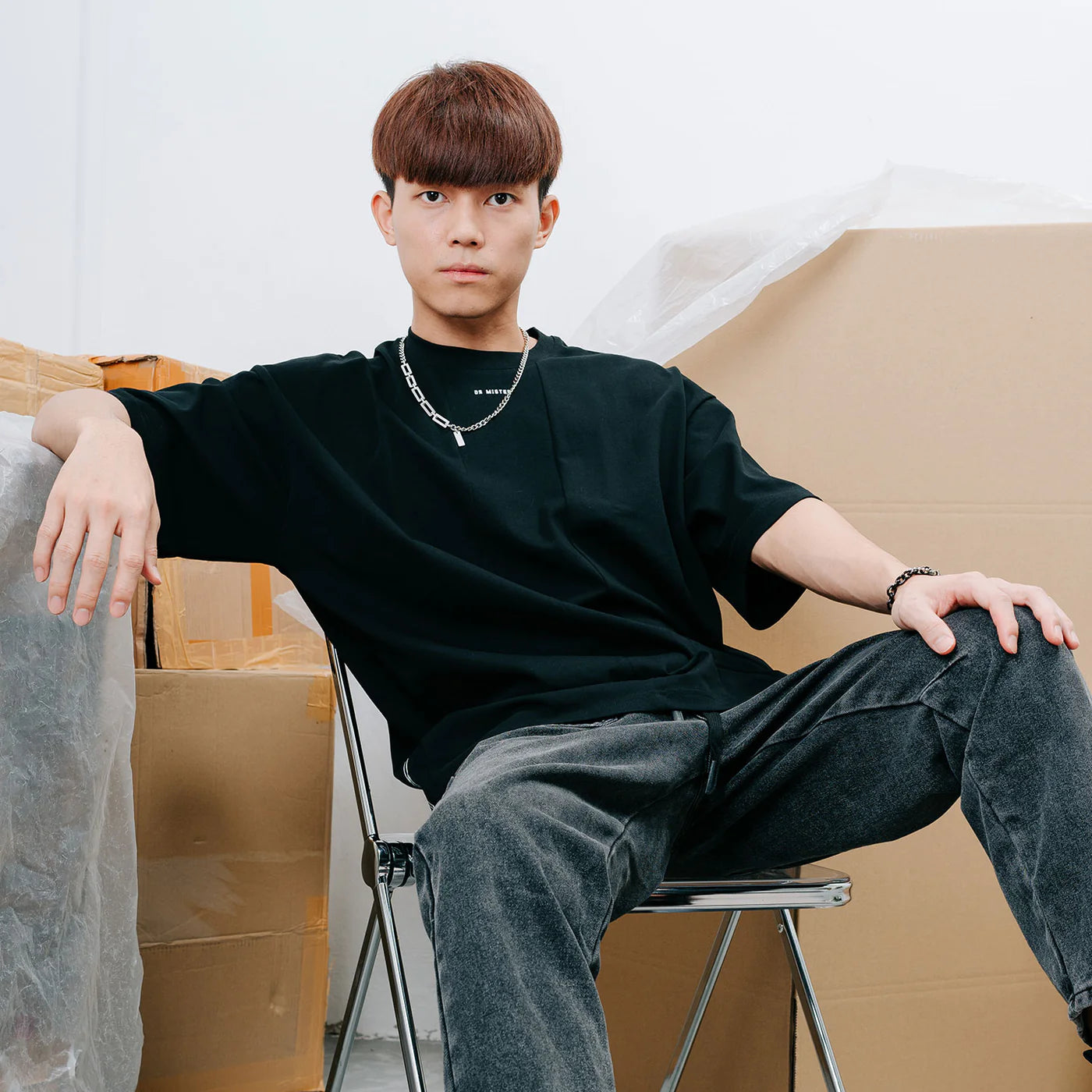 Cotton Oversized Tee features a distinctive dropped-down shoulder cut and paneled design.The front features a tiny logo type combines with the back minimally with a subtle yet elegant "i" brand motif on both sides. brand graphic logo is printed on the left side of the sleeve.
