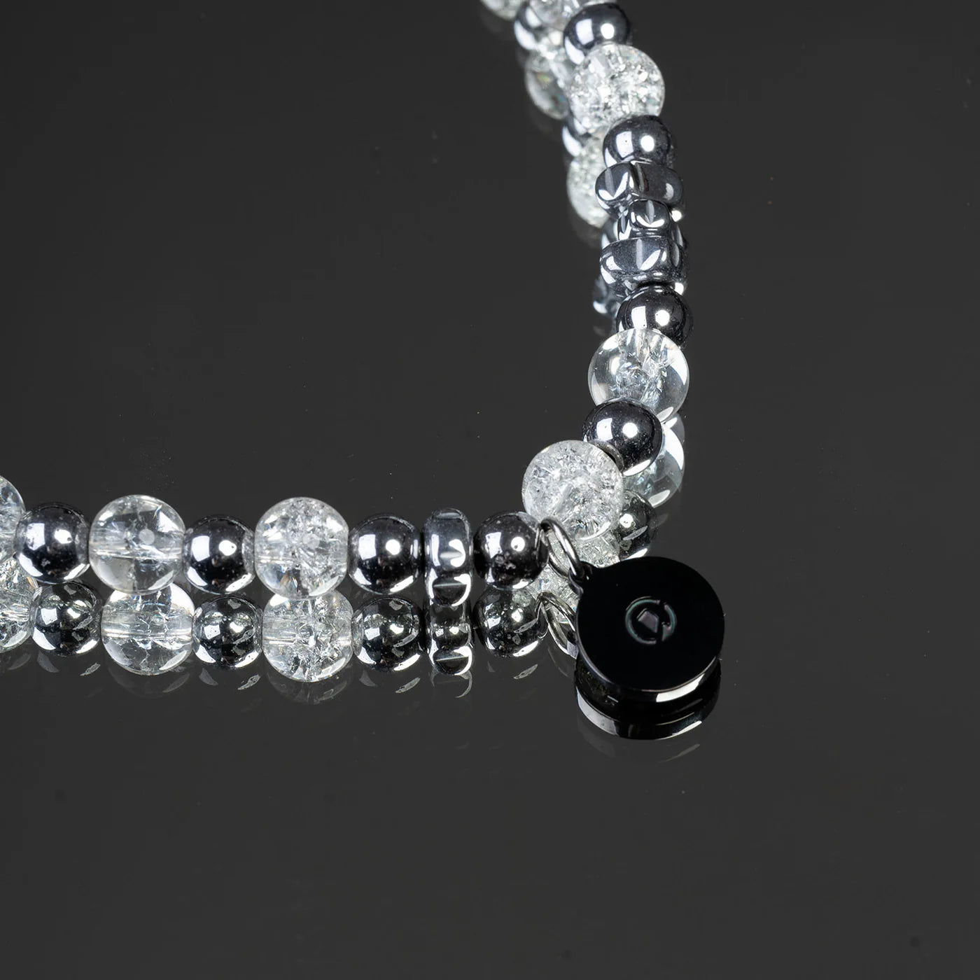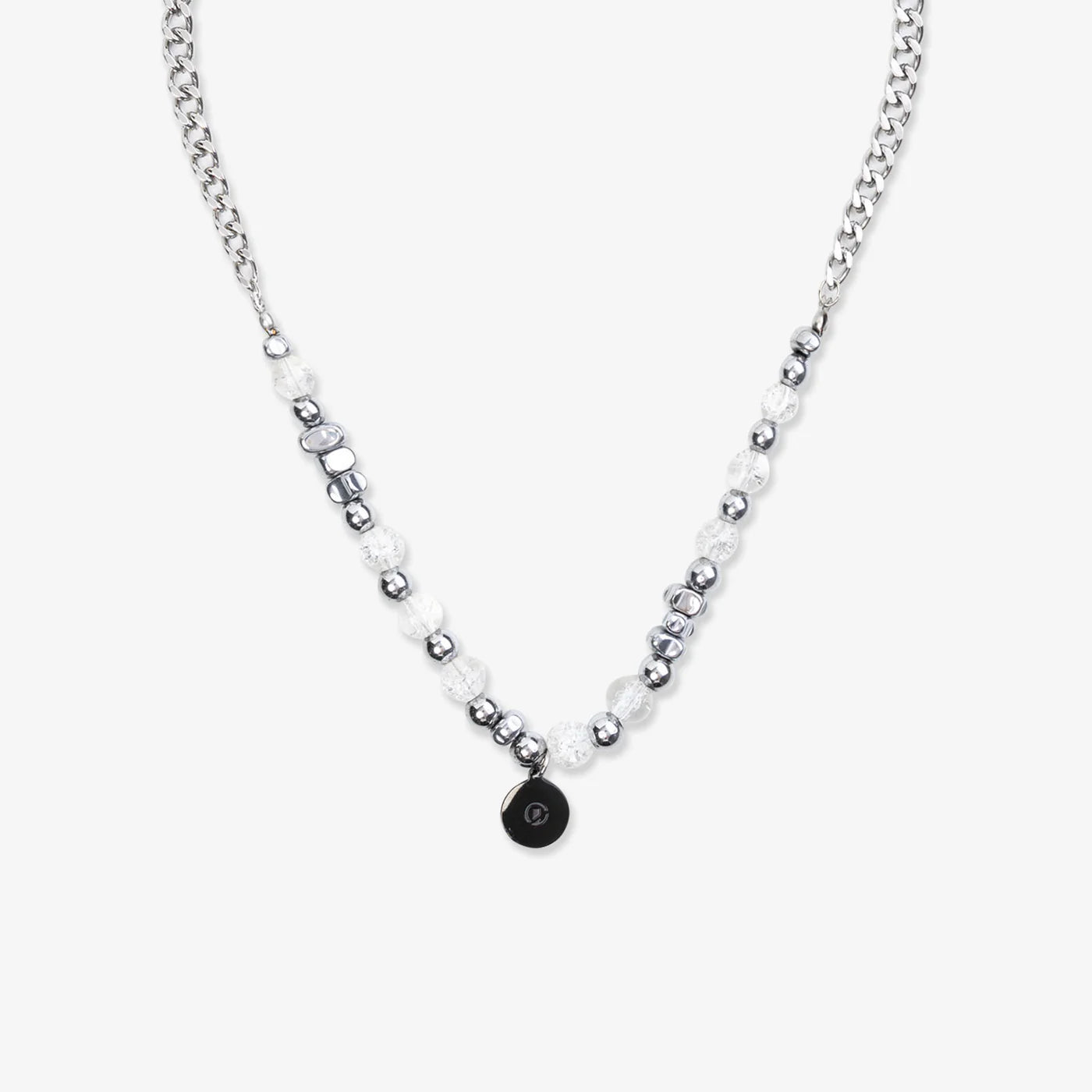 Made from the highest quality 316L stainless steel. This necklace features a mixture of Textured clear crystal and steel pebbles, complimented with 5mm cuban chains. Attached with a Blackout round pendant.