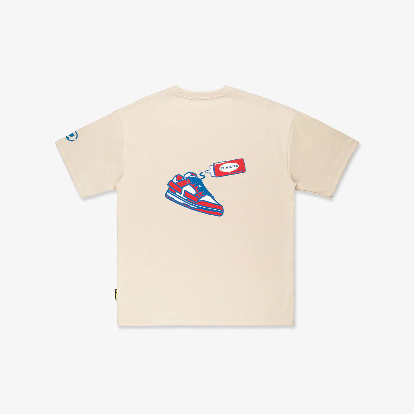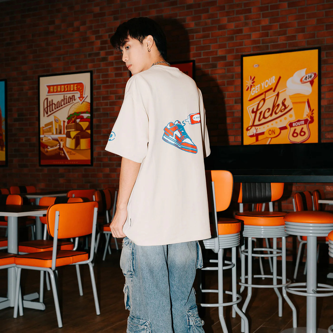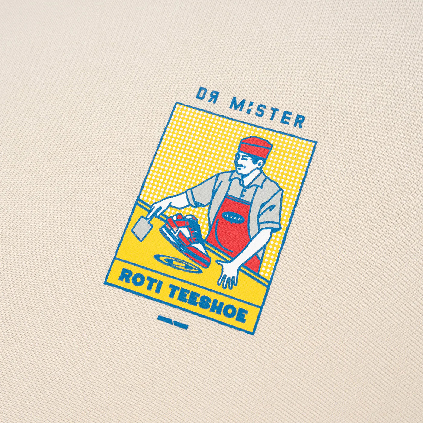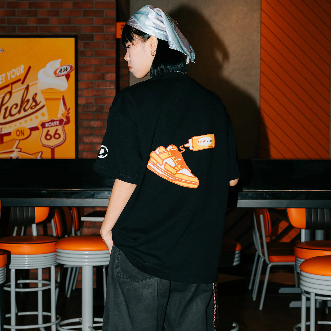 Crafted from black combed interlock cotton, it features the local “Mamak” making Roti Tissue, with sneakers shaped like Roti Tissue. The graphic uses a wordplay, “Roti Teeshoe”. The back displays a sneaker graphic, where the shoelace turns into ketchup as it connects to a ketchup bottle.