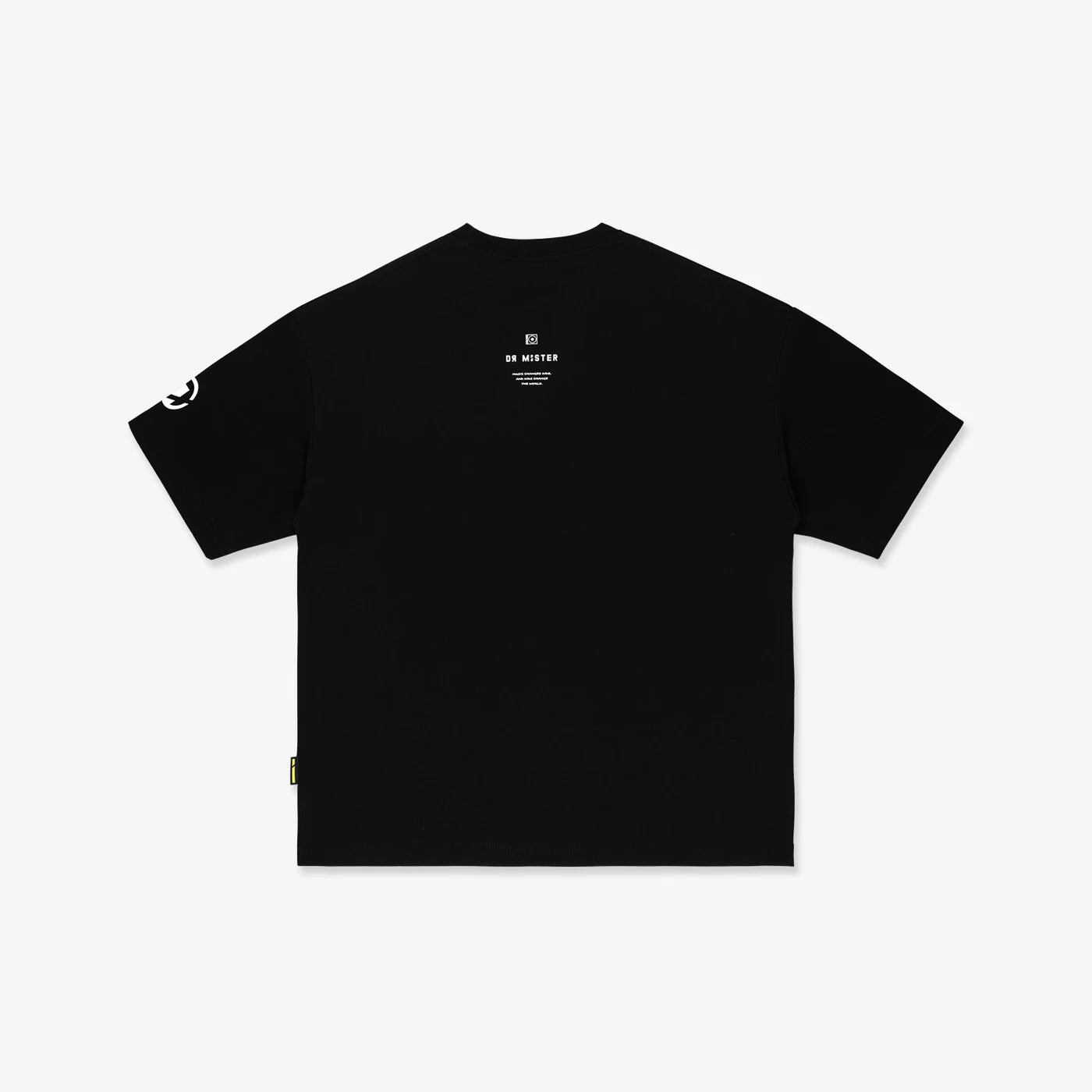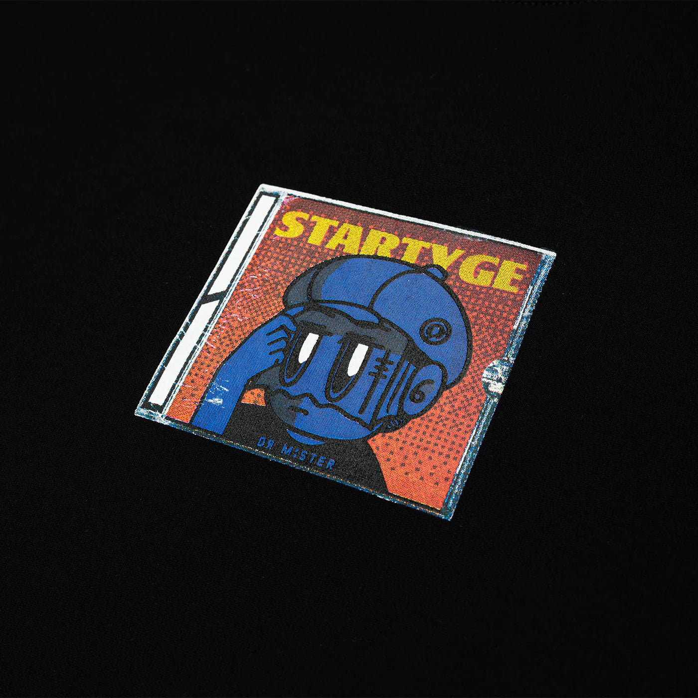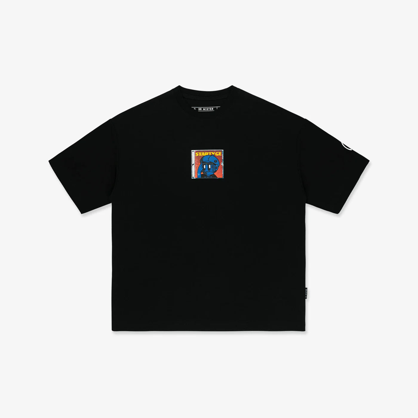 This black broad tee is made from cotton-polyester and comes in an oversized cut. It features a “Startyge” album cover graphic, inspired by The Weeknd’s Starboy at the front. The back showcases a mini disc case with our brand logo along with the brand name and collection phrase in distinctive font.